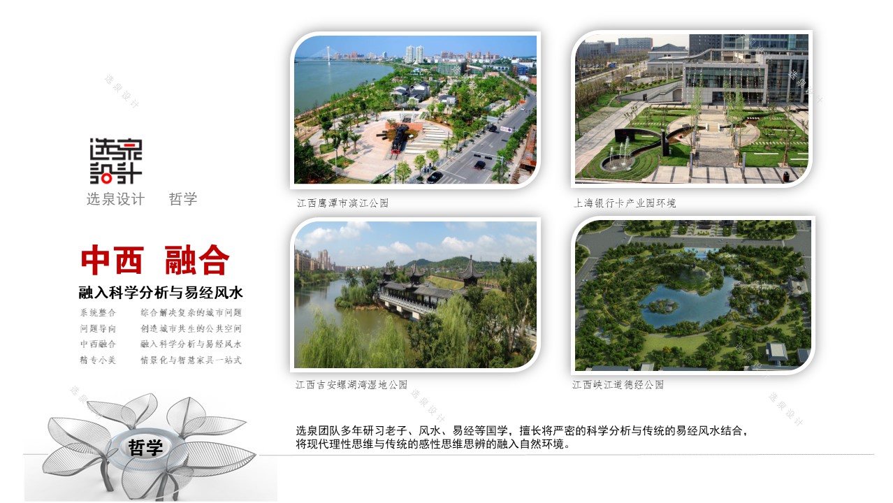 選泉團隊多年研習老子、風水、易經(jīng)等國學,擅長將科學分析與易經(jīng)風水結(jié)合,將現(xiàn)代理性思維與傳統(tǒng)的感性思維思辨的融入自然環(huán)境。
