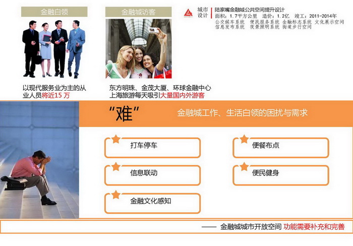 泉:1.7平方公里的陸家嘴金融城里林立著50多座高樓,匯聚著15萬(wàn)人白領(lǐng),但在“軟”環(huán)境上和紐約、東京等國(guó)際金融城相比,距離“宜居宜商”的環(huán)境有不少距,其實(shí)不僅是上?,F(xiàn)在很多城市中心區(qū)都面臨同樣一個(gè)問(wèn)題,那就是在總體規(guī)劃時(shí)對(duì)公共空間考慮不夠,除了“硬”的建筑群外,“軟”的公共空間不是缺失,就是布局不合理,公共空間不怡人、沒(méi)有人情味,缺乏人性化設(shè)施,使用起來(lái)不方便,有空間卻沒(méi)活力。陸家嘴作為改革開(kāi)放的龍頭,中國(guó)金融城的典范和先行者,對(duì)于它的研究有一定的代表性。我們通過(guò)現(xiàn)場(chǎng)及樓宇白領(lǐng)發(fā)放問(wèn)卷、物業(yè)協(xié)調(diào)組織調(diào)查等多渠道廣泛調(diào)研,獲取關(guān)于交通、文化、信息等城市功能滿(mǎn)意度情況,總結(jié)出3大問(wèn)題:打車(chē)停車(chē)難、餐飲吃飯難、行車(chē)認(rèn)路難。用大眾語(yǔ)就是“路難走、車(chē)難停、樓難尋”。此外還有各種難困擾白領(lǐng):便民健身難、信息聯(lián)動(dòng)難、文化感知難等。