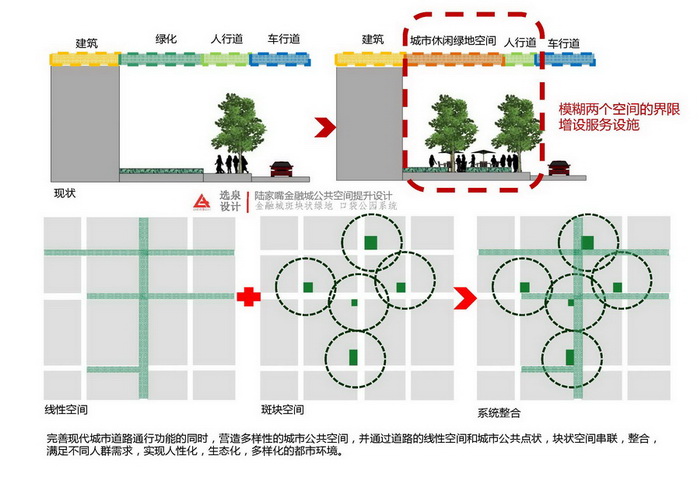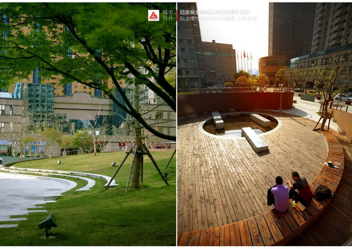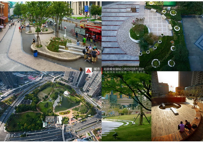陸家嘴有知名的中心綠地,雖然大但使用性可達(dá)性差,有美麗的濱江綠帶但間斷對(duì)內(nèi)沒(méi)有連續(xù),有繁忙的街頭但卻沒(méi)有可停留的綠地。針對(duì)問(wèn)題,改造道路“線(xiàn)性綠地空間”,協(xié)調(diào)樓宇置換出“塊狀綠地空間”,并將線(xiàn)狀,塊狀公共空間有奇機(jī)串聯(lián),整合,最終形成呈網(wǎng)絡(luò)斑塊分布的“陸家嘴口袋公園系統(tǒng)”,他們面積小,但安全、尺度宜人,內(nèi)設(shè)人性實(shí)施,滿(mǎn)足不同人群需求,充滿(mǎn)活力和人文情懷。目前已經(jīng)建成了東方明珠旁的“錦庭雨洪花園廣場(chǎng)”、大華銀行前的休閑綠地、竹園商貿(mào)區(qū)東方國(guó)際大廈旁的午后休閑花園、金洲街銀洲街東城路區(qū)塊線(xiàn)性公共空間提升、陸家嘴西路富城路區(qū)塊線(xiàn)性公共空間提升等。目前正在實(shí)施的是中國(guó)最高--上海中心大廈的外環(huán)境設(shè)計(jì),我們以功能導(dǎo)向在上海中心四周構(gòu)建一條曲線(xiàn)的白領(lǐng)休閑、健身步道,在其中有序穿插精致的休閑服務(wù)空間,并置入除霾降溫、吸煙站、直飲水、雨洪等人性化設(shè)施。