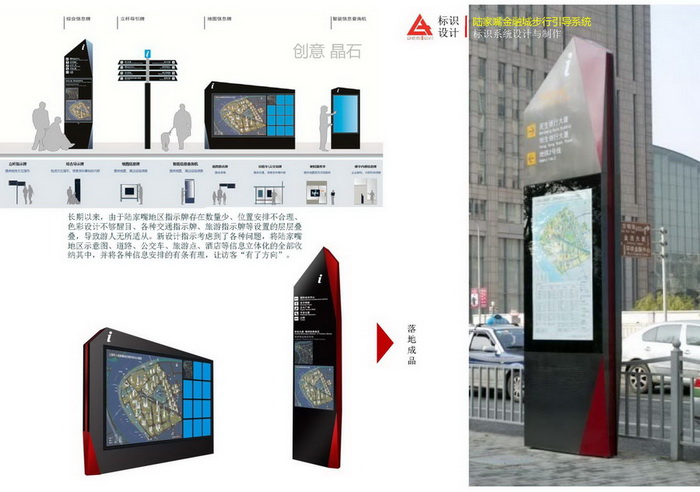 標(biāo)識(shí)引導(dǎo)系統(tǒng)方面:優(yōu)化行人標(biāo)識(shí)指引系統(tǒng),首期分級(jí)別增設(shè)了61塊綜合導(dǎo)示牌、17塊立桿指示牌、12塊地圖信息牌 、7塊出租車(chē)揚(yáng)招牌。解決訪(fǎng)客游客“認(rèn)路難”問(wèn)題;優(yōu)化停車(chē)引導(dǎo)系統(tǒng),利用陸家嘴辦公大廈地下車(chē)位資源,設(shè)置2級(jí)停車(chē)誘導(dǎo)屏,并將它納入城市智能系統(tǒng)。緩解“行車(chē)方向不明”、“停車(chē)難”問(wèn)題。值得一提的是,在路名牌的設(shè)計(jì)上,沿用2006上海APEC峰會(huì)間我們?cè)O(shè)計(jì)出的浦東新型道路名牌,采用了“一桿兩牌直角式”,能指示交叉道路信息,在文字內(nèi)容上增加了路段的門(mén)牌號(hào)碼信息,運(yùn)用“蓄光型自發(fā)光發(fā)光”材料,增加信息的夜間識(shí)別性。雖然這是一個(gè)小小舉措,但是社會(huì)反饋很好。路名牌雖小卻不小,它能反映城市道路設(shè)施是否真正做到“以人為本”。