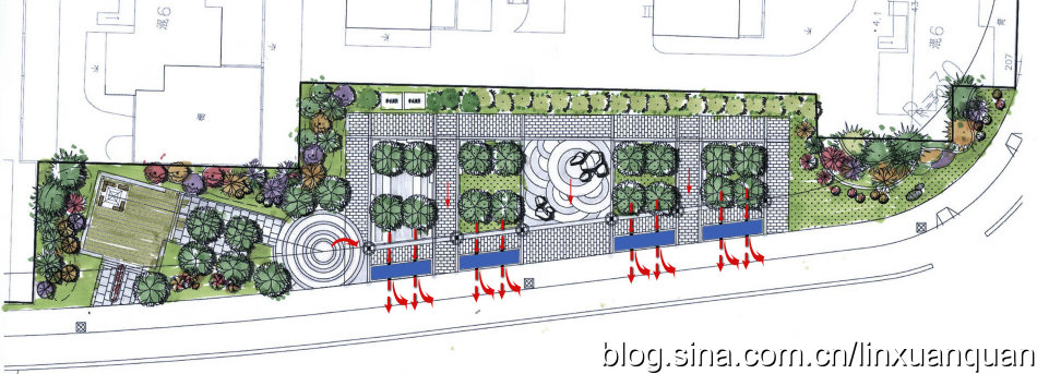 設(shè)計打破直線市政人行道形式在大廈四周構(gòu)建一條曲線的休閑、健身步道,