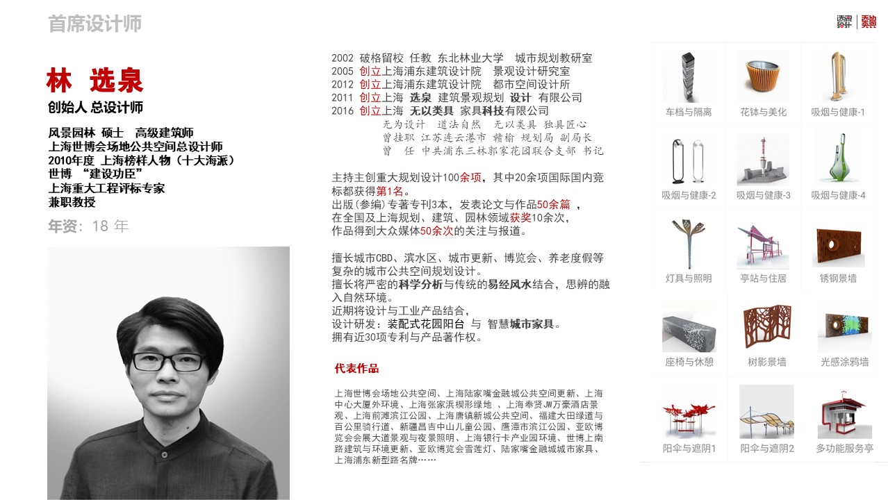 上海世博會(huì)場(chǎng)地公共空間、上海陸家嘴金融城公共空間更新、上海中心大廈外環(huán)境、上海張家浜楔形綠地、上海前灘濱江公園、上海唐鎮(zhèn)新城公共空間、福建大田綠道與百公里騎行道、新疆昌吉城北主題公園、昌吉CBD環(huán)境、鷹潭市濱江公園、亞歐博覽會(huì)會(huì)展大道景觀與夜景照明、上海銀行卡產(chǎn)業(yè)園環(huán)境、世博上南路建筑與環(huán)境更新、鷹潭市杰翔瀚宮建筑與景觀、鷹潭市月湖灣養(yǎng)老社區(qū)建筑與景觀、江西吉安螺湖灣濕地公園、陸家嘴金融城城市街具設(shè)施、上海浦東新型路名牌……