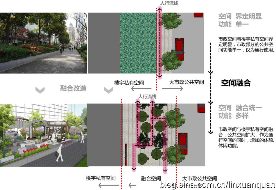 對于該改造也是如此。各個大廈是以建筑紅線為基準,在各自的地塊內(nèi)設(shè)置車行道,停車場及相關(guān)的配套設(shè)施如垃圾收集站等,綠化成為空間的“軟分割物”,因此建筑與建筑之間的空間完全沒有使用價值,僅僅只是通行的功能。