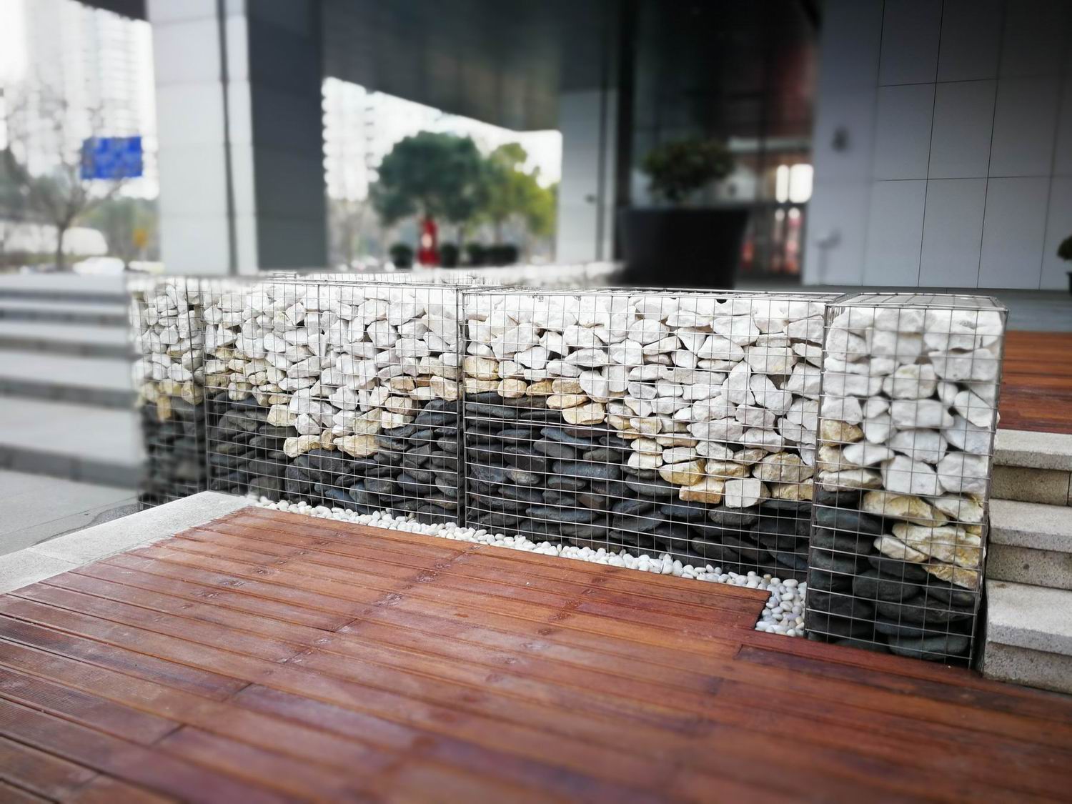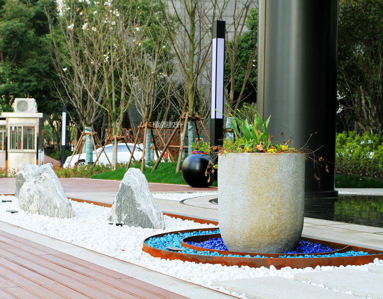 林蔭健身步道的休閑空間,置入石籠墻與坐凳,純粹的河石、樸拙的景墻與周邊的商務(wù)樓形成強烈對比,形成自然與時尚、鄉(xiāng)土與現(xiàn)代的矛盾、融合。在南方天然河道里,人工精心挑選天然的黑、紅、白色河石,堆砌出自然石墻肌理,并用細不銹鋼筋網(wǎng)片筑成籠罩固定。