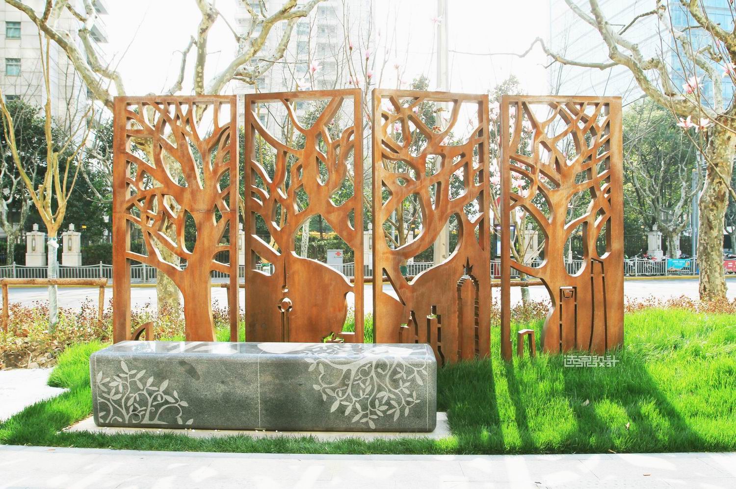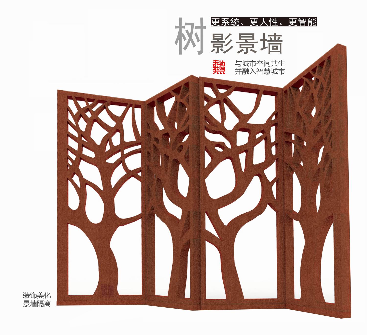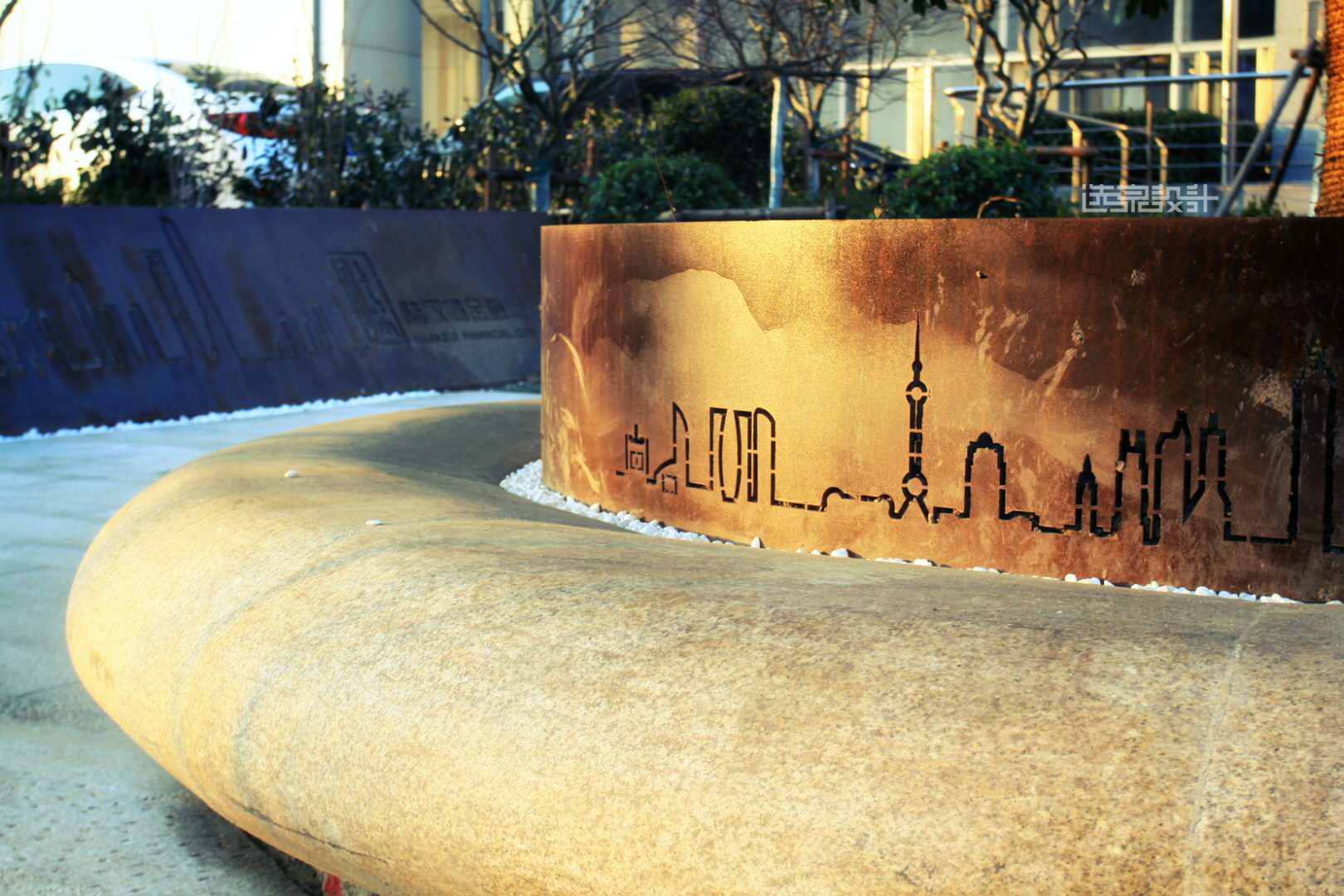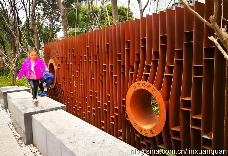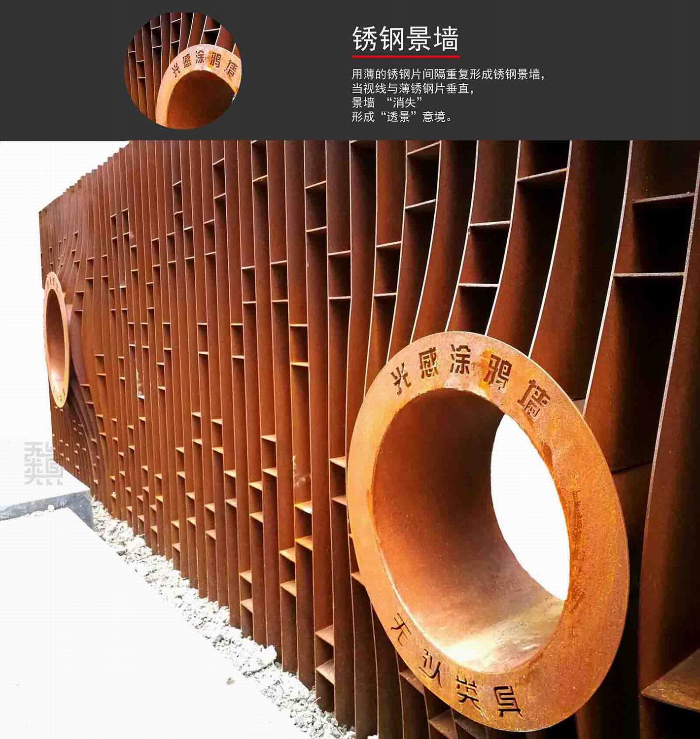 用薄的銹鋼片作為簡單幾何單元,“橫向”或者“豎向”間隔重復形成銹鋼景墻,當視線與薄銹鋼片垂直,景墻“消失”,墻后的景色透露眼簾,形成傳統(tǒng)園林“透景”意境。當視線與銹鋼片呈斜角,銹鋼片重疊形成密實的銹鋼墻。行進的人由于視角變化相應銹鋼景墻也呈現(xiàn)出“若有若無”意境。銹鋼因銹蝕程度不同會隨著時間變化而呈現(xiàn)紅色的變化,用這種時間與空間的抽象手法來融入周邊環(huán)境。