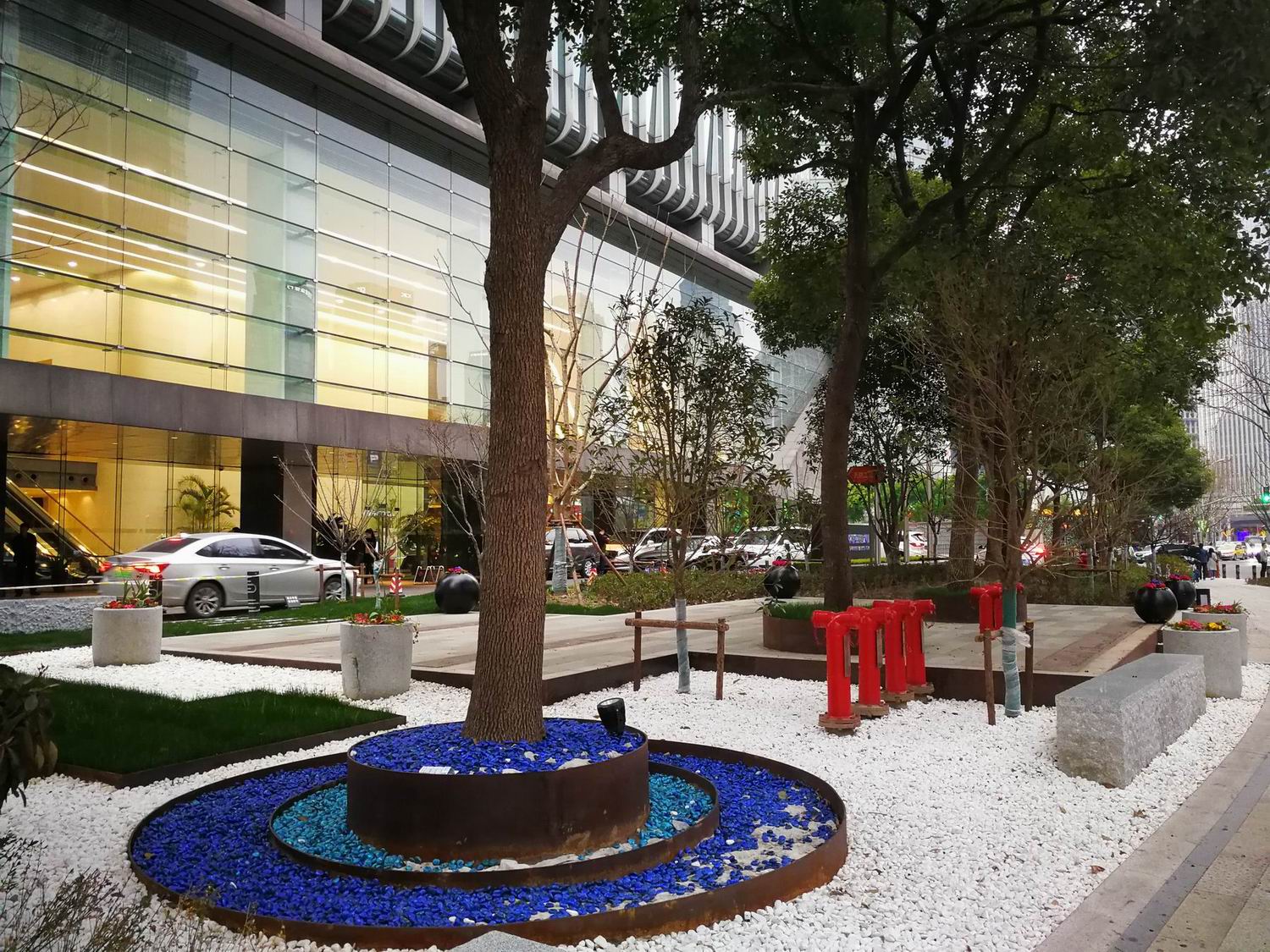 金磚大廈西側(cè)道路僅保留4M作為消防車道,增加3M寬綠化帶,設(shè)置林蔭路。