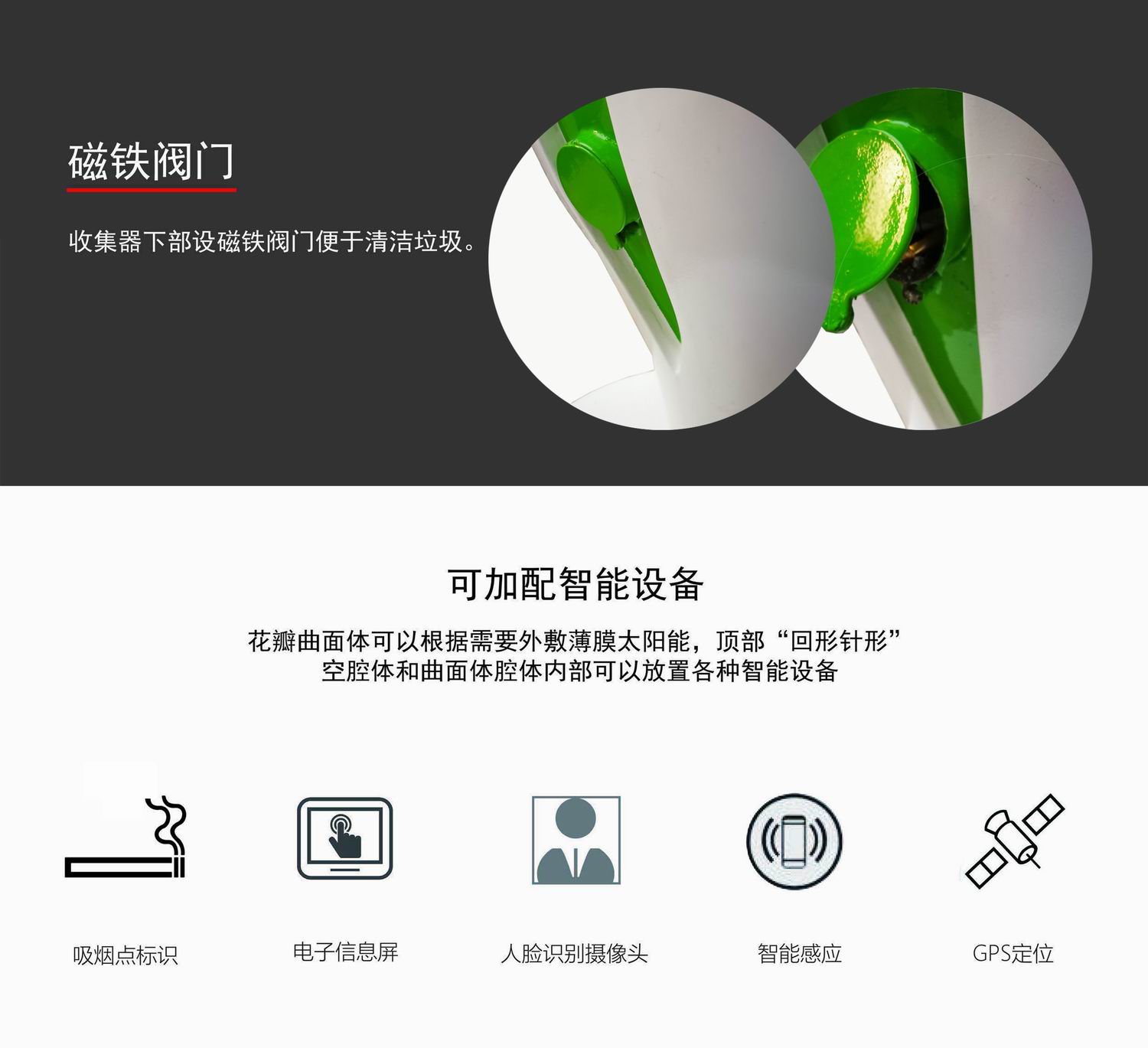 外觀中部是4片花瓣組合成圓形腔體,花瓣間設(shè)置4個火炬狀煙灰收集器,其數(shù)量可增減,收集口上部斜面帶蓋可避免雨水流入,下部設(shè)磁鐵閥門便于清潔垃圾?;ò昵骟w可以根據(jù)需要外敷薄膜太陽能,腔體內(nèi)部可以放置各種智能設(shè)備。