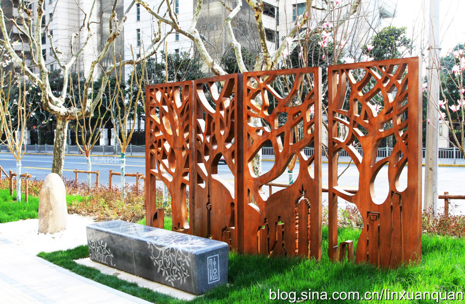 用薄的銹鋼片作為簡單幾何單元,“橫向”或者“豎向”間隔重復形成銹鋼景墻,當視線與薄銹鋼片垂直,景墻“消失”,墻后的景色透露眼簾,形成傳統(tǒng)園林“透景”意境。當視線與銹鋼片呈斜角,銹鋼片重疊形成密實的銹鋼墻。行進的人由于視角變化相應銹鋼景墻也呈現(xiàn)出“若有若無”意境。銹鋼因銹蝕程度不同會隨著時間變化而呈現(xiàn)紅色的變化,用這種時間與空間的抽象手法來融入周邊環(huán)境。