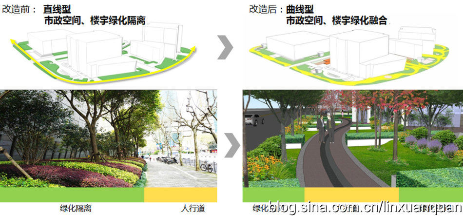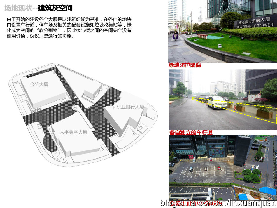 對于該改造也是如此。各個大廈是以建筑紅線為基準,在各自的地塊內(nèi)設(shè)置車行道,停車場及相關(guān)的配套設(shè)施如垃圾收集站等,綠化成為空間的“軟分割物”,因此建筑與建筑之間的空間完全沒有使用價值,僅僅只是通行的功能。