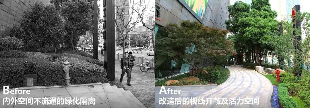 2、同利益方的要求不同。地塊內(nèi)的公共空間是通過地塊共享、集約、置換等方式“擠”出來的,因此方案針對的業(yè)主就有政府管理部門,大廈物業(yè)方(國企和外資),需要協(xié)調(diào)他們不同的需求,有的希望保持防護綠化的現(xiàn)狀,安全且便于管理。有的希望方案有所突破,而城市管理部門傾向于后期方便管理和養(yǎng)護。