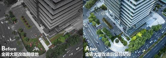 ▼改造前與后的金磚大廈口袋公園咖啡吧©選泉設(shè)計
