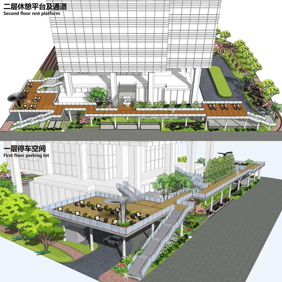 為了空間的集約有序,解決陸家嘴空間緊張的問題,未來二期改造還可以嘗試在地面一層設(shè)置停車場,然后二層設(shè)置休閑平臺,并且將二層休閑平臺與二層建筑形成接口,這樣既解決了陸家嘴空間緊張沒有公共空間的問題,同時也解決了停車難的問題。