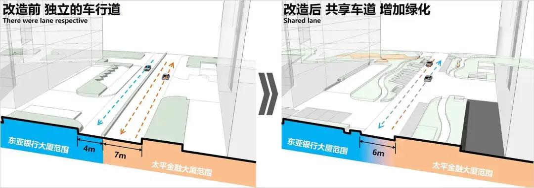 ▼改造后位于太平金融大廈及金磚大廈之間的共享車道©選泉設(shè)計