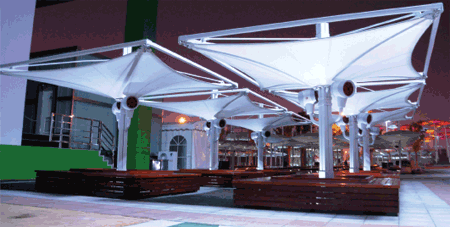 林選泉在固定遮陽(yáng)棚上采用了聚酯纖維網(wǎng)格布材料,帶網(wǎng)孔的遮陽(yáng)材料,能防霉、能遮擋紫外線、表面具有自潔性。“我們把透光率控制在符合規(guī)范的范圍內(nèi),”林選泉介紹說(shuō),“顏色越深,材料的透光率越低,因此世博園內(nèi)的遮陽(yáng)材料,我們一般采用的是米黃、淺灰、淡綠等顏色?!边@樣的顏色既不會(huì)在世博園內(nèi)顯得突兀難看,又能有效地達(dá)到遮陽(yáng)的效果。此外,在世博園內(nèi)一頂頂可移動(dòng)的遮陽(yáng)傘面上林選泉選取了用植物染料為方法,這種內(nèi)著色的生物染色方法,不但不易褪色,能長(zhǎng)久的保持美觀,并且對(duì)環(huán)境的污染較小。