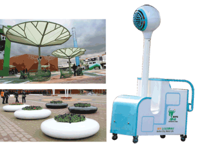 在游覽世博會(huì)的時(shí)候,細(xì)心的游客也許還會(huì)發(fā)現(xiàn),世博園公共空間內(nèi)的基礎(chǔ)設(shè)施,在不同展示區(qū),也在不斷變臉。比如遮陽(yáng)傘,它在亞洲館區(qū)域,采用青綠色的鋼條支架,看起來(lái)有點(diǎn)像用竹子做出的傘;在美洲館區(qū)域,一頂頂雨葉傘呼應(yīng)美洲雨林湖泊的自然環(huán)境特征;而在非洲館區(qū)域,遮陽(yáng)傘則被設(shè)計(jì)成為茅屋的形狀,以呼應(yīng)非洲文化。林選泉解釋說(shuō),這些是根據(jù)五大洲主題需要而設(shè)置的主題遮陽(yáng)傘,也是抽象表達(dá)文化的載體。 展館圍合形成的廣場(chǎng)空間面積從幾千到幾萬(wàn)平方米不等,形成適宜人體尺度的空間感受,林選泉設(shè)計(jì)了一系列符合場(chǎng)地風(fēng)格的小品,如花缽、花球、花箱、樹(shù)箱等來(lái)烘托廣場(chǎng)空間的環(huán)境氛圍:在亞洲館區(qū)域,人們可以欣賞到用黑白棋子做成的植物花缽;在非洲館區(qū)域,植物的容器變成了陶土材料;而在歐洲館區(qū)域花缽容器則成了金屬……營(yíng)造出色彩繽紛、熱烈歡愉的展會(huì)環(huán)境。 遮陽(yáng)降溫,遮的不僅是陽(yáng)光 為期184天的上海世博會(huì)展期間會(huì)受到梅雨、臺(tái)風(fēng)、高溫等災(zāi)害天氣的影響,夏季持續(xù)時(shí)間一般140天以上,光33℃以上高溫就可能超過(guò)1個(gè)月。在世博規(guī)劃中,日平均高峰客流量預(yù)估達(dá)到60萬(wàn)人次,而這里面的展館面積只能容納10到15萬(wàn)人,那么就意味著有近45萬(wàn)人會(huì)在館外,要完成這45萬(wàn)人的解暑任務(wù),公共空間的遮陽(yáng)降溫設(shè)施起到了根本性作用。