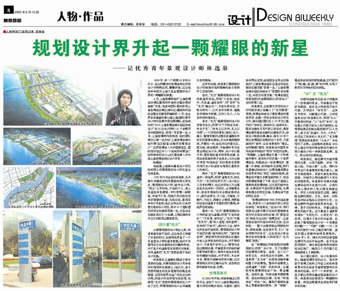 1970年代末出生的林選泉,系天津大學(xué)建筑學(xué)院風(fēng)景園林碩士研究生,景觀規(guī)劃設(shè)計(jì)師、城市設(shè)計(jì)師。“而立”之年的他,不高的個(gè)兒,看上去甚至有些瘦弱;平時(shí)常戴一副眼鏡,書(shū)卷氣十足,但鏡片后閃爍的目光卻智慧而沉著;與他交流,顯得罕有的少年老成。他已主持主創(chuàng)20余項(xiàng)重大規(guī)劃設(shè)計(jì)項(xiàng)目,其中10個(gè)國(guó)際國(guó)內(nèi)項(xiàng)目競(jìng)標(biāo)都獲得第一名,并且結(jié)合實(shí)踐發(fā)表論文10余篇,工程實(shí)踐和學(xué)術(shù)論文均獲得過(guò)重要獎(jiǎng)項(xiàng)。