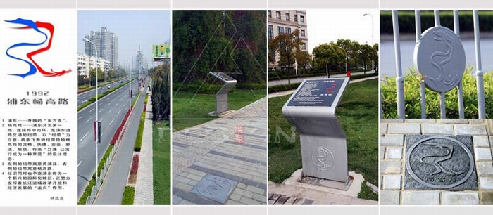 林選泉:嗯,是的。同樣的小設(shè)計我這還有一個例子,是浦東開發(fā)開放第一路--楊高路標(biāo)識的創(chuàng)立與運用。它是楊高路改造景觀系統(tǒng)中的一個小部分,整體景觀改造上我認(rèn)為不能僅僅關(guān)心速度,而是整個交通空間環(huán)境質(zhì)量的改善,努力實現(xiàn)“交通·讓出行成為一種享受” 這一美好愿望。為了增強楊高路道路文化內(nèi)涵,我策劃設(shè)計了“升騰的東方龍”等一系列LOGO,并通過公眾參與方式投票確立最終方案,將其運用到道路隔離欄、人行道鋪裝等附屬設(shè)施中,并在人流大的重要節(jié)點設(shè)立“標(biāo)識創(chuàng)意說明”。這一系列做法目的是想讓大眾解讀楊高路道路文化內(nèi)涵,在詮釋中加深道路文化的認(rèn)同。提升楊高路形象。我記得當(dāng)時有媒體稱“道路也可以像商品一樣擁有自己的商標(biāo),這在上海屬首次”。這種做法也影響了后來浦東其它改造和新建的道路。
