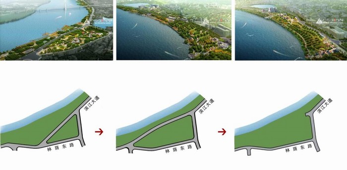 (圖3) 并且在這個基礎(chǔ)之上,取消沿江大道延伸段,將公園作為一個整體設(shè)計,并對周邊的林蔭路進(jìn)行拓寬,以解決周邊交通與居民的可達(dá)性問題(圖4)。在城市建設(shè)之初,就已經(jīng)遠(yuǎn)瞻性的將環(huán)境優(yōu)美的濱江地段保留下來,為城市的可持續(xù)發(fā)展打下了良好的自然基礎(chǔ)。這也給設(shè)計帶來了充分的發(fā)揮空間,以盡最大的能力來滿足城市可持續(xù)發(fā)展的需要。