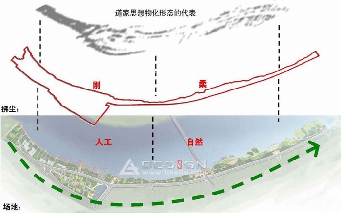 四、設(shè)計理念 鷹潭龍虎山是中國道教的發(fā)源地,鷹潭被稱為中國道都,道教的洞天福地。濱江公園的設(shè)計理念受到道教文化的啟發(fā),提煉出“自然之道”的設(shè)計理念,以“道法自然”的生態(tài)觀和“陰陽哲學(xué)”的平衡觀,努力營造人工與自然相融合的濱水生態(tài)景觀。場地整體形態(tài)構(gòu)思源自道家思想物化形態(tài)的代表——拂塵,反映道家柔中可剛的思想,景觀形態(tài)剛?cè)岵?jì)從南到北實現(xiàn)人工向自然的逐漸演化和過渡。公園功能上分為老碼頭文化區(qū)、濱水活動區(qū)、公園游覽區(qū)、江灘生態(tài)區(qū)這四大部分,并通過“理水之道、控溫之道、植綠之道、造景之道”來讓“江、岸、城、人”有機(jī)的融合在一起,最終建設(shè)濱水景觀文化走廊、建立沿江休閑開放空間軸、構(gòu)筑城市綠色生態(tài)廊道(圖6)。  (圖6) 設(shè)計“自然之道”這一設(shè)計理念受到道教文化的啟發(fā),但是這種啟發(fā)不能僅僅提留在關(guān)注道教文化的表層,而是將這種文化精髓物化成空間載體,體現(xiàn)在場地設(shè)計中,順應(yīng)原有場地特征,公園原有南部是老碼頭棚戶區(qū),而到了北部則留有一定的灘涂地,設(shè)計總體風(fēng)格體現(xiàn)了人工與自然的融合,景觀形態(tài)剛?cè)岵?jì),從南到北實現(xiàn)了由人工向自然的逐漸演化和過渡,南段以硬質(zhì)的人工化景觀為主,北段以軟質(zhì)的自然景觀為主,表達(dá)了對地形以及原有植被的尊重(圖7)。