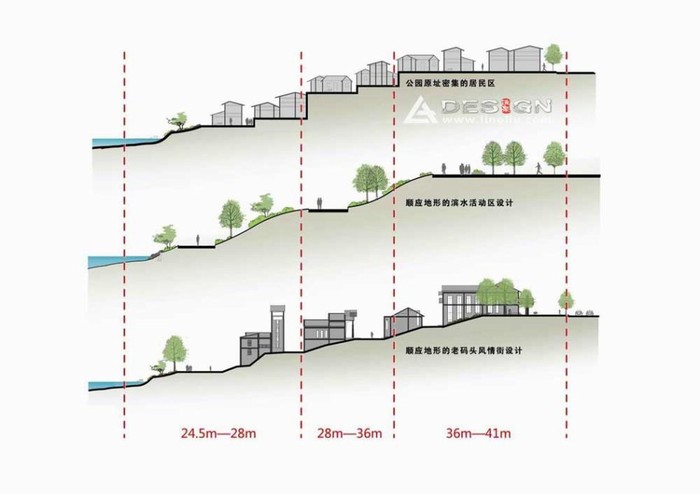 2)場地現(xiàn)狀高差處理,設(shè)計順勢而為 盡管對于高差的處理,在城市化建設(shè)的過程中,水利工程師已經(jīng)用鋼筋鐵墻表達(dá)了“人定勝天”的精神力量。但是出于對道教文化的“無為”思想以及當(dāng)代的生態(tài)理念的推崇,針對場地現(xiàn)狀高差較大,景觀設(shè)計師采取充分尊重場地原有地形,設(shè)計融入“無為”思想,摒棄大開大挖,重整場地地形,而是順勢而為,面對十幾米高差的江岸,依據(jù)原棚戶區(qū)有機(jī)形成的三層“臺地式”地形(圖15),