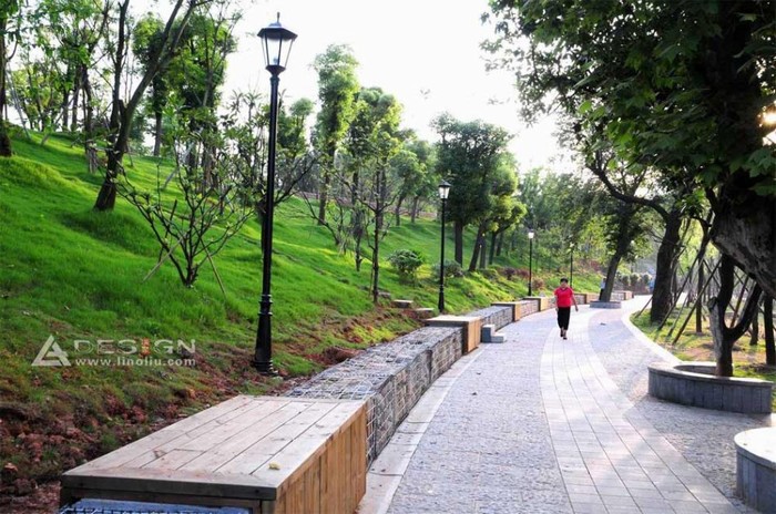軸線內(nèi)穿插了“山之園、水之園、銅之園、道之園”四大主題園。一個是具有現(xiàn)代空間形式的“現(xiàn)代景觀軸”,這兩個傳統(tǒng)與現(xiàn)代軸線交織對比,達(dá)到傳統(tǒng)和現(xiàn)代的融合與統(tǒng)一。環(huán)繞全園的步行道為交通主框架,蜿蜒的步道與旱溪(圖28)穿插其間。