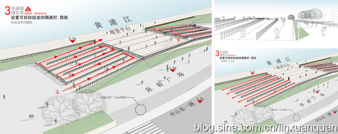 ?????如果出現(xiàn)超高密度人流,人流無序出現(xiàn)在緩坡的情況,可以在坡道上根據(jù)人流大小合理設(shè)置多道(依據(jù)人流通過斷面分析)分流的欄桿,上海世博會經(jīng)驗是將排隊區(qū)1列的寬度集約到0.8-1.2米寬。而且這種欄桿不能采用布條的“軟隔離欄”,需要采用市政的“硬隔離欄”,欄桿端部可活動調(diào)節(jié),欄桿基礎(chǔ)采用可插入式,欄桿本身可以拆卸組裝,在平日人流量不多的時候,可以全部移除或者間隔移除隔離欄,如果保留隔離欄,人流可以在寬敞的隔離欄桿間的空間可以自由的上下,而一遇到節(jié)假日或是節(jié)日活動,調(diào)節(jié)移動端部欄桿,封閉中間的欄桿端部通道,只留一個進(jìn)出的口,利用交警輔助引導(dǎo)人流(圖3)。同樣,也可以借鑒上海世博會最熱門沙特館,面對8-9小時超長時間排隊,我們研究不下二十幾種的排隊方案:之字形,回字形、直線形,同時武警領(lǐng)隊,一個個千人方陣前進(jìn),遇到急事臨時要出隊可以領(lǐng)卡,卡的不同顏色代表不同功能[7]?;剡^頭來看外灘,一旦人流密集超過管理極限,就需要在坡道的欄桿群里預(yù)先設(shè)置一條緊急通道,就像高速路上的快速撤離通道。如果這些通道在沒有事發(fā)的時候利用率低,且影響設(shè)計整體,那可以借用現(xiàn)有措施,比如通往觀景臺下的停車場的通道,我相信一般人不會去地下停車場逛的,所以它相對于景區(qū),人流量低,所以在未來,地下車庫的通道需要和應(yīng)急車道、外部空間整合,和景區(qū)整合,可以讓人從應(yīng)急通道中撤離,讓救護(hù)車第一時間到達(dá)事發(fā)地點。?