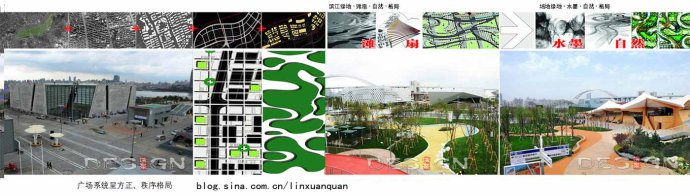 對于廣場與綠地兩個系統(tǒng),廣場空間布局采用“方正、秩序” 格局,而綠地空間布局呈“曲線、自然”格局,兩者在對比中形成呼應。