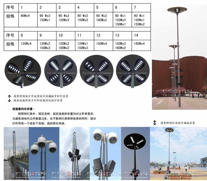 除照明燈具外,園區(qū)音響、監(jiān)控設(shè)施的布置均對(duì)立桿有需求,為避免場(chǎng)地內(nèi)立桿數(shù)量過(guò)多,在不影響燈具照明效果的同時(shí),部分燈桿帶有一個(gè)或多個(gè)音響、監(jiān)控探頭終端。