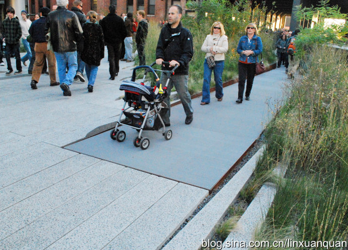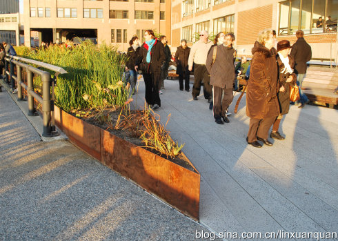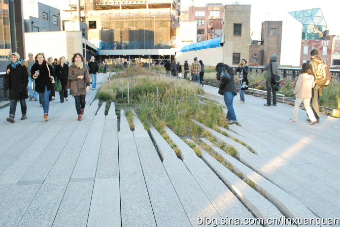 為了保留鐵軌的這種歷史記憶,Highline整體設(shè)計采用了豎線風(fēng)格,是對原來鐵軌豎線風(fēng)格的一種延續(xù)。而這種延續(xù)不僅是平面上同時其上的人性化設(shè)施包括坐凳,直飲水等設(shè)施,都采用了和豎線相協(xié)調(diào)的極簡風(fēng)格。整體上采用了結(jié)合不同的小空間以及和不遠(yuǎn)處的哈德孫河進(jìn)行景觀上,空間上的呼應(yīng),因此也并不單調(diào)。
