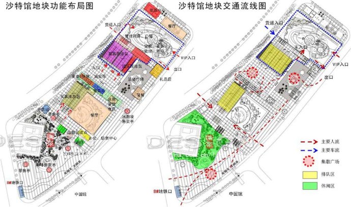 基地用地面積為57248平方米。設(shè)計(jì)主要圍繞沙特館運(yùn)營(yíng)需求考慮,沙特館主入口設(shè)計(jì)有安檢及配套辦公建筑,原印度館設(shè)計(jì)為排隊(duì)等候區(qū),沿博城路一側(cè)設(shè)計(jì)有禮品店、簡(jiǎn)餐廳,人行高架下部設(shè)計(jì)有冷飲店和游客服務(wù)中心,都圍繞著排隊(duì)等候區(qū)和休閑、集散廣場(chǎng),提供各種配套服務(wù)。在尼泊爾北部廣場(chǎng)設(shè)計(jì)售票點(diǎn),在原臺(tái)灣館、尼泊爾館前廣場(chǎng)和集中綠地邊零星布置5個(gè)售賣(mài)亭,以滿足游客購(gòu)物需求。