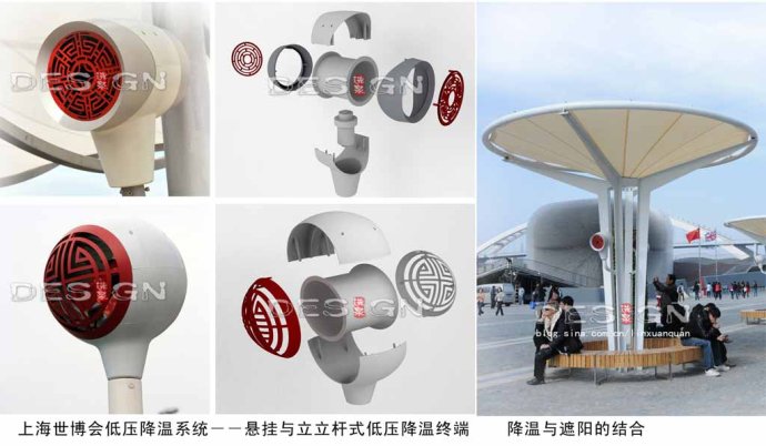 通過(guò)以上對(duì)基于人體舒適度因子的降溫四大途徑的分析,在高密度人流開(kāi)放空間中,通過(guò)以上對(duì)改善人體舒適度因子的途徑的分析,在高密度人流開(kāi)放空間中,改善人體舒適度要必須具備影響人體舒適度的四大因子。通過(guò)系統(tǒng)比較論證,在上海世博會(huì)場(chǎng)地公共空間中設(shè)計(jì)了低壓霧噴降溫系統(tǒng)和遮陽(yáng)系統(tǒng),以改善人體舒適度,從其中一個(gè)視角實(shí)現(xiàn)世博場(chǎng)地設(shè)計(jì)的人性化表達(dá)