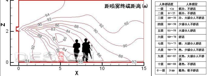 實(shí)驗(yàn)研究表明,采用低壓可移動(dòng)式霧噴降溫設(shè)備,當(dāng)行走人群以0.9-1.4m/s 的步速行進(jìn),可以感受到步行引導(dǎo)區(qū)內(nèi)1~8m/s的風(fēng)速,裸露皮膚的平均液體沉降<5ml/min,100米引導(dǎo)區(qū)行走獲得的液體量<6ml,并迅速蒸發(fā),不會(huì)產(chǎn)生不適感。