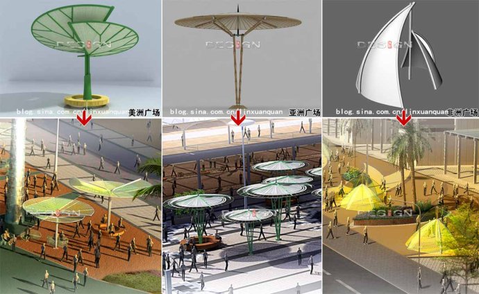 世博場(chǎng)地廣場(chǎng)空間布局采用“方正、秩序” 的格局,除了網(wǎng)絡(luò)化的鋪裝使其具有方向感與秩序性外,結(jié)合人流設(shè)計(jì)的遮陽(yáng)體系對(duì)人流的引導(dǎo)也有著積極作用:將遮陽(yáng)傘線性連續(xù)排列,指明主要展館展區(qū)方向并與廣場(chǎng)的“交通性空間”積極呼應(yīng),實(shí)現(xiàn)空間引導(dǎo)的輔助作用。