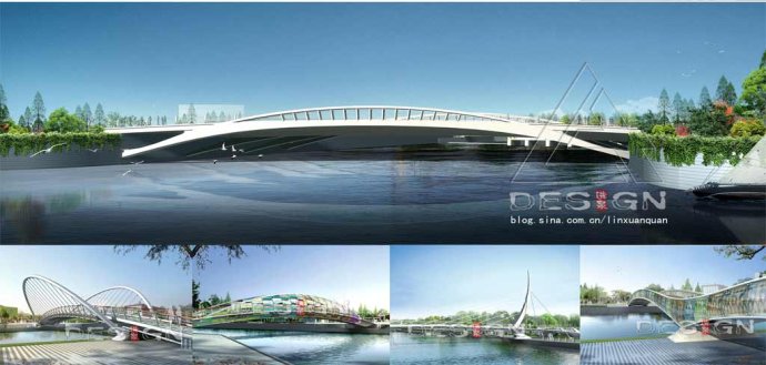 The approach of “bridge landscape CI theory “[5]is applied in the design of the Puming vehicular bridge and the Bailian Jing pedestrian bridge(figure 14). Under the guide of the unity of engineering and landscape, the bridge type is chosen and the unique feature is defined. Seen from the whole world exposition and waterfront contour line, the Puming Bridge located at the river mouth do not need any landmark; what it needs is “the harmony with the environment, so the three-span continuous frame arch bridge is the final choice which can deal