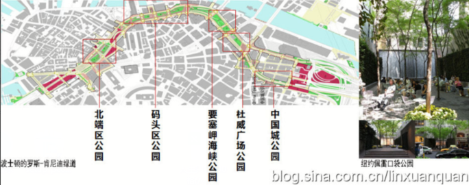 ??? 該設(shè)計(jì)靈感來(lái)源于現(xiàn)實(shí)的兩個(gè)案例,一個(gè)是美國(guó)波士頓的羅斯-肯尼迪綠道,該綠道是美國(guó)“大開(kāi)挖”的產(chǎn)物,將穿過(guò)波士頓市中心的高架中央大道拆除,引入到地下隧道后,在原來(lái)的地面空地上建成了一條貫穿南部碼頭區(qū)和北區(qū)盡頭的綠色綠道,將這些分割的帶狀空間通過(guò)林蔭大道串聯(lián)起節(jié)點(diǎn)公園。同時(shí),借鑒了美國(guó)紐約市的口袋公園體系的做法,在高密度發(fā)展的城市中心,通過(guò)尺度宜人的小公園系統(tǒng)來(lái)彌補(bǔ)城市綠地臨近性差的問(wèn)題。