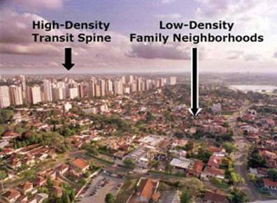 國外在實踐中,通過以下措施在 生態(tài)城市建設(shè)方面取得了一定的成功:明確而具體現(xiàn)實的目標(biāo)體系、具體的項目、突出的重點領(lǐng)域、生態(tài)建設(shè)與城市建設(shè)的一體化推進(jìn)、詳細(xì)的分工實施體系、廣泛的公眾參與,加上具有明確法律地位和角色定位的推進(jìn)和實施機構(gòu)及完善的法律條例、市場化的管理體制等作為支撐條件[16]。如被認(rèn)為最接近生態(tài)城市的巴西庫里蒂巴市生態(tài)城市建設(shè)的成果經(jīng)驗就可以概括為:①公交導(dǎo)向式的城市開發(fā)規(guī)劃(如圖1圖2);②實行垃圾回收項目;③關(guān)注社會公益項目;④對市民進(jìn)行環(huán)境教育[17]。其中,城市沿著城市交通主軸向外發(fā)射發(fā)展,這些軸線的交匯點在城市中心區(qū),公交為導(dǎo)向的城市開發(fā)將所有的土地利用和開發(fā)密度進(jìn)行了分區(qū),5條軸向道路中的4條(即軟封閉的城市快速道路)旁邊地塊的容積率為6,而其他普通公交線路服務(wù)區(qū)的容積率為4,離公交線路越遠(yuǎn)的地塊容積率越低。庫里提巴市政府只允許距離公交線路旁2個街區(qū)進(jìn)行高密度開發(fā),并嚴(yán)格控制距公交線路2個街區(qū)外的建筑密度和高度,形成了以城市主干道為軸線的城市建筑階梯型向空中發(fā)展的模式[18]。