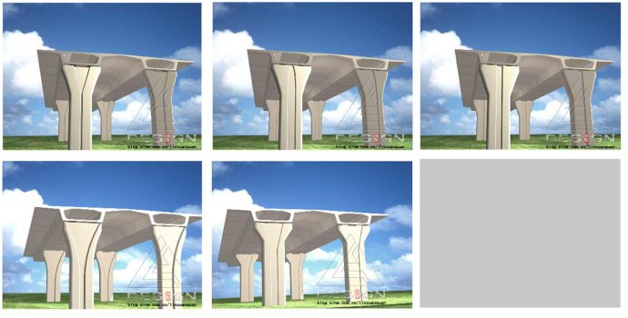 松花江大橋引橋橋墩材料以混凝土為主材料,具有可塑性,其形態(tài)設計自由度大。在原設計的帶凹槽Y形橋墩的造型基礎上, 考慮了橋墩立體形態(tài)的虛實、剛柔、凹凸及光影變化,運用計算機“虛擬真實”技術引申設計出了一系列Y形橋墩。(圖10 為松花江大橋橋墩造型景觀設計部分方案)
