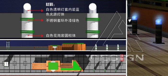 機(jī)動(dòng)車(chē)防撞欄處布置誘導(dǎo)性景觀小燈柱以“補(bǔ)充”機(jī)非隔離帶上布置的交通照明燈的照明。并對(duì)車(chē)輛起誘導(dǎo)照明作用。誘導(dǎo)性景觀小燈柱本身不發(fā)光,只是在柱身適當(dāng)部位涂上交通上用的熒光漆,以節(jié)約能源。在白天,誘導(dǎo)性景觀小燈柱“劍”的造型又起到裝飾景觀作用(如圖11)。